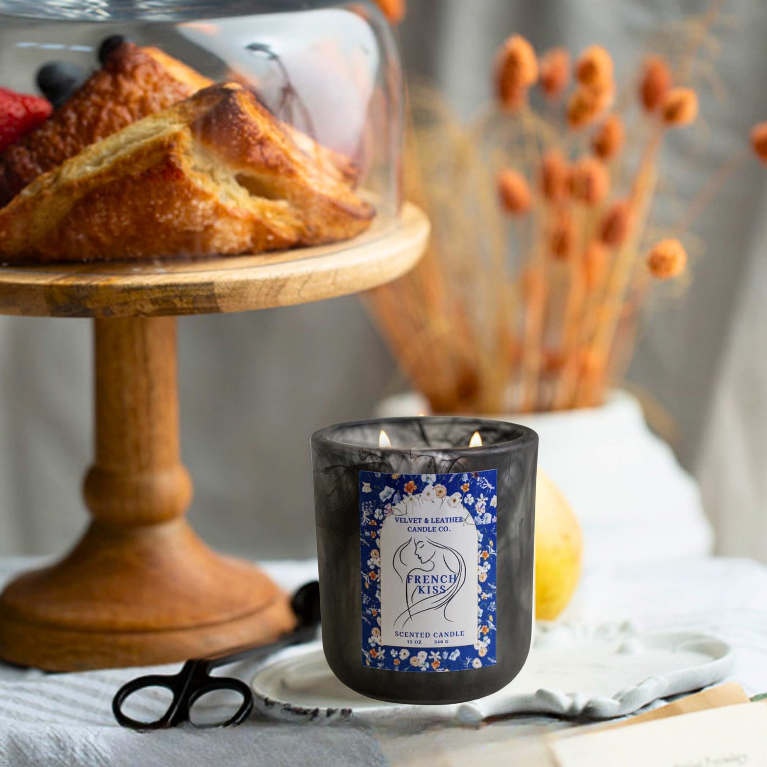 A lit scented candle labeled 'French Kiss' with a drawing of two faces, placed on a white cloth with a pair of black scissors nearby. Behind it, there is a wooden cake stand with slices of cake under a glass cover, and a vase with dried orange flowers in the background.